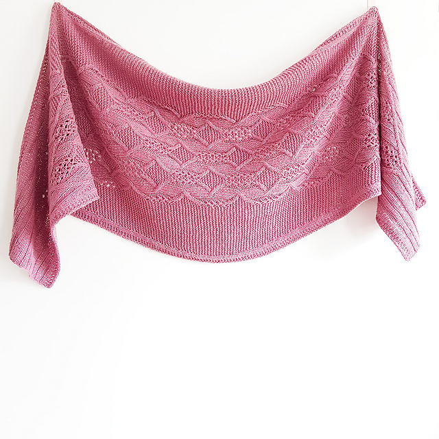 An elegant cable & lace motif builds an eye-catching centre part in this large and cozy wrap. It beautifully grows in and out of the ribbed tips of the shawl and is framed by garter stitch wedges.