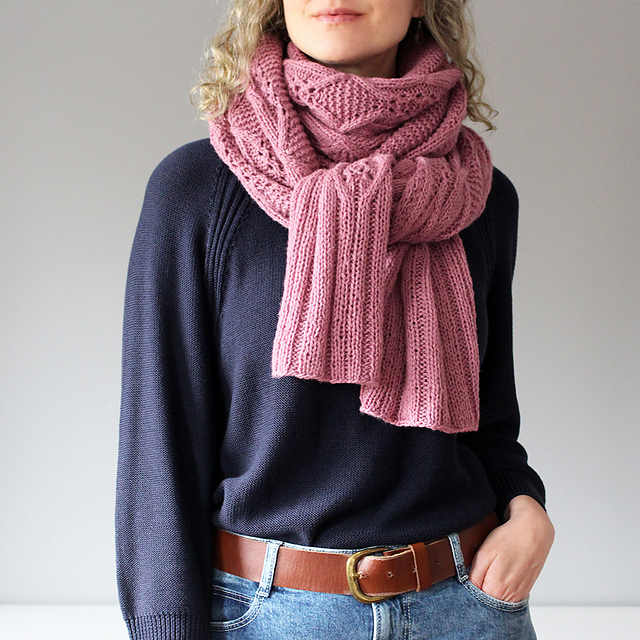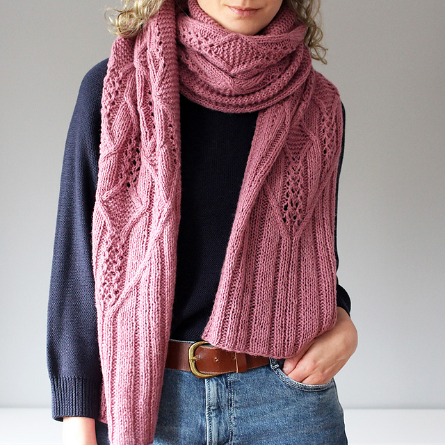 The construction is worked sideways from tip to tip as an elongated ellipse-like shape which makes it enjoyable to knit and easy to wear. The pattern is adjustable to the yardage you have available or if you prefer to make a smaller/larger shawl.