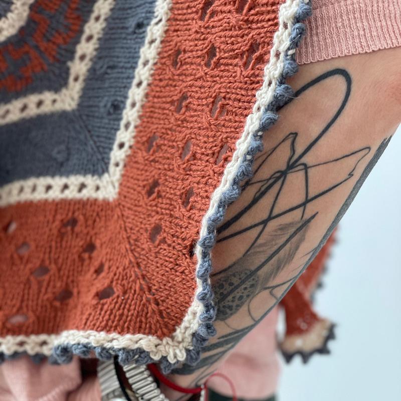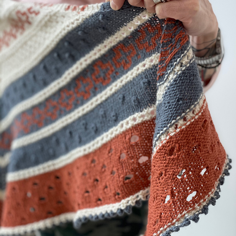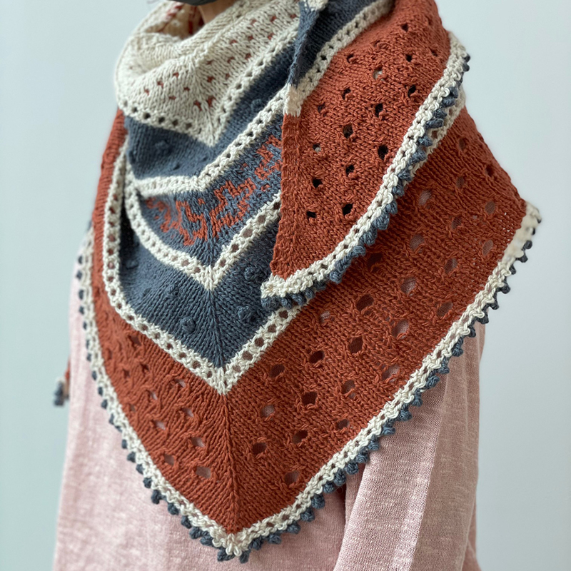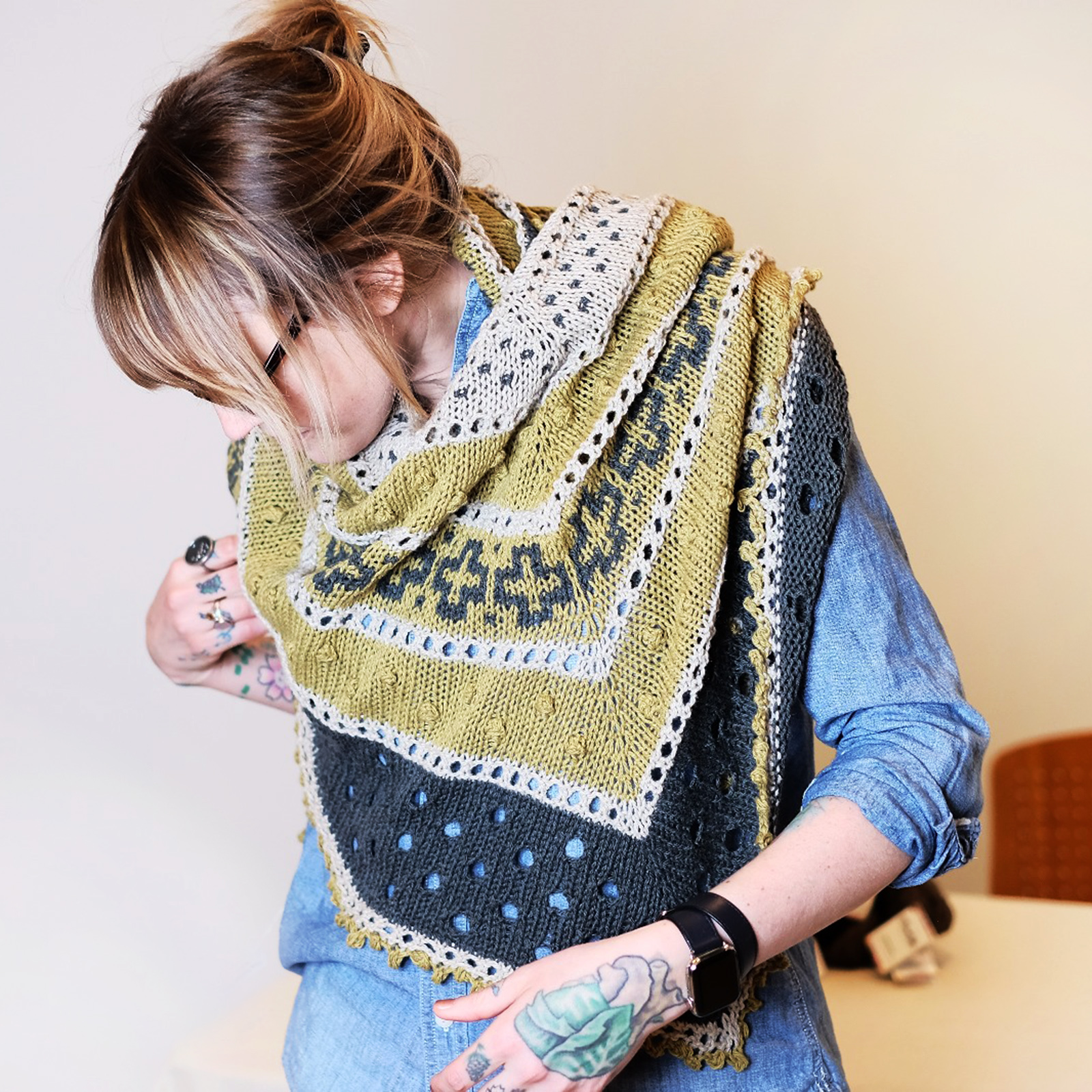 This shawl epitomizes what I love about shawl knitting. It is the perfect canvas to play with different techniques and color combinations! Enjoy playing with mosaic knitting, bobbles, and even some eyelets in this satisfying worsted weight shawl pattern!