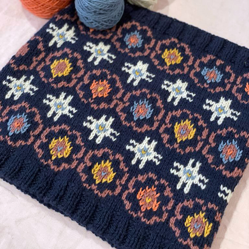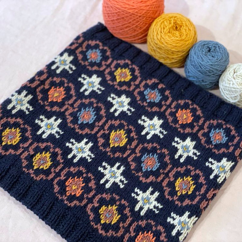 A colourwork cowl with a difference, Vera combines Fair Isle and duplicate stitch embroidery to create a striking pattern effect. Perfect for knitters with a love for colour and embellishment, Vera is an ideal project to expand your surface design skill set. This design requires six colours of DK-weight yarn: three for the Fair Isle and three for the embroidery.