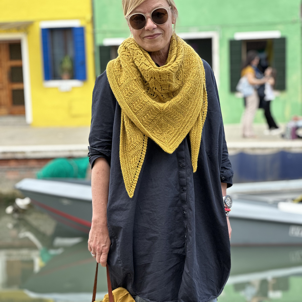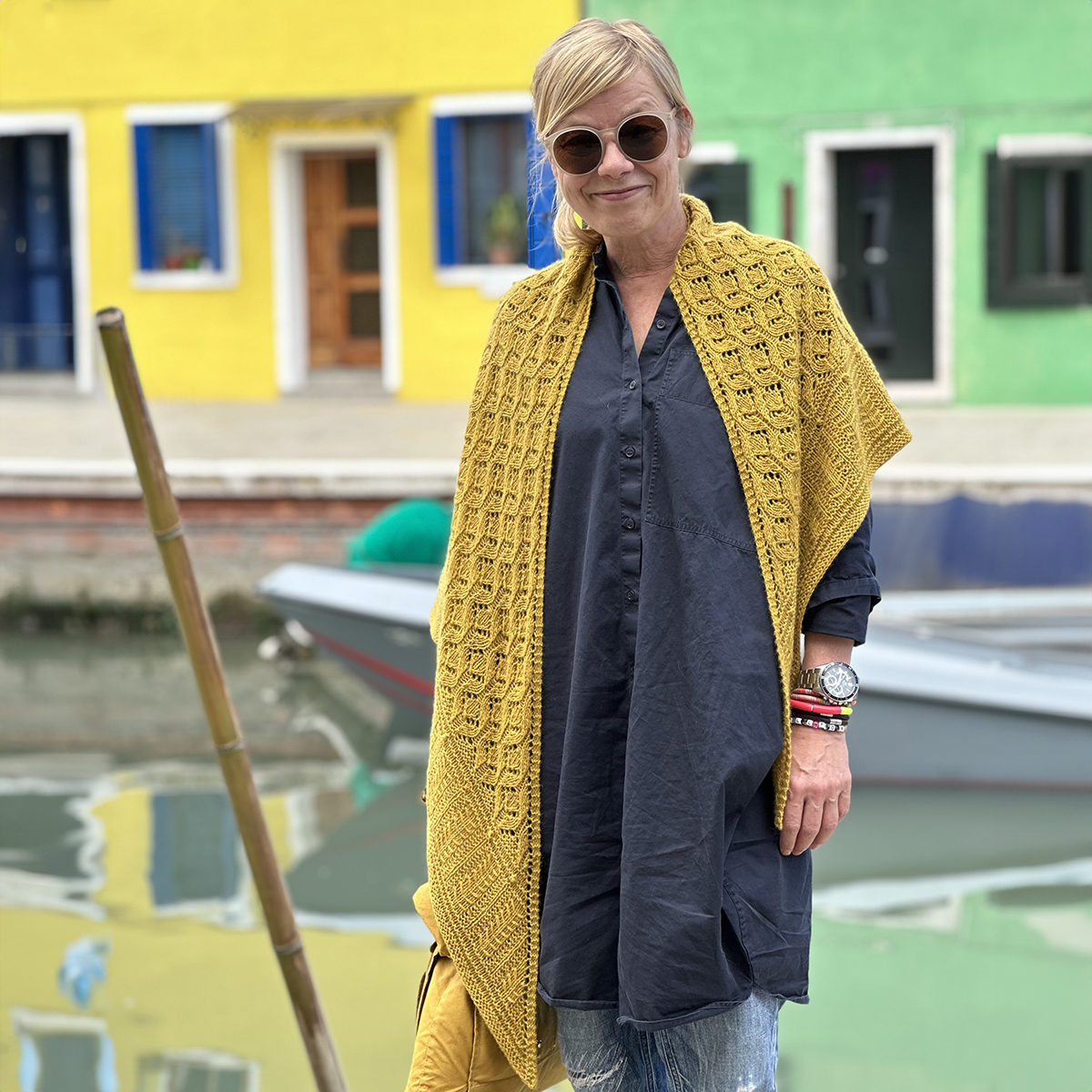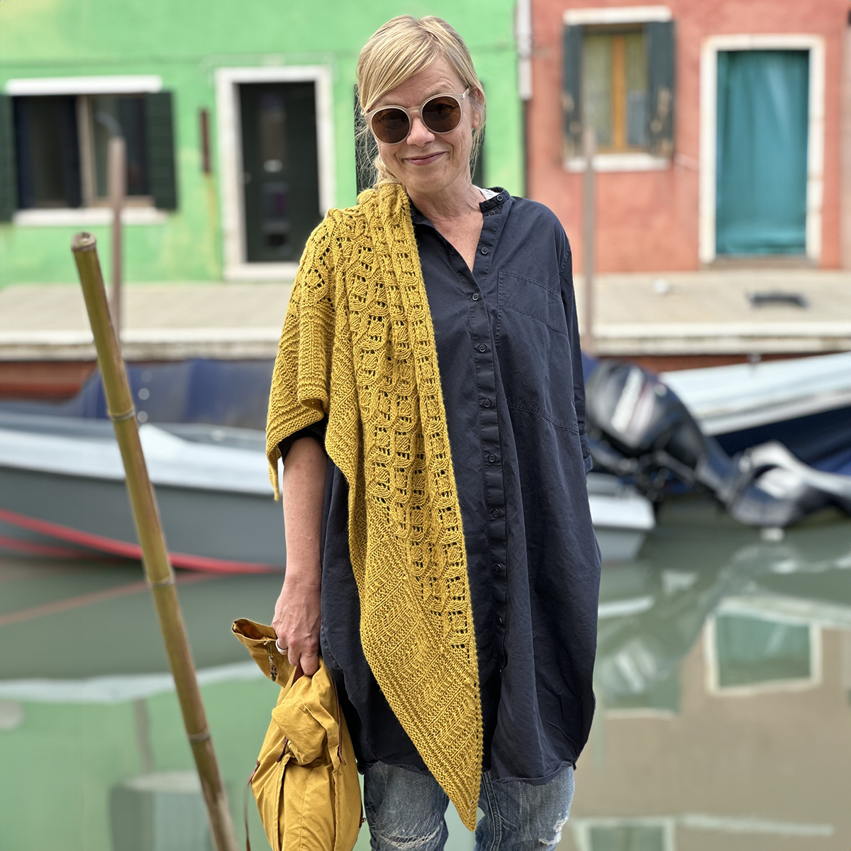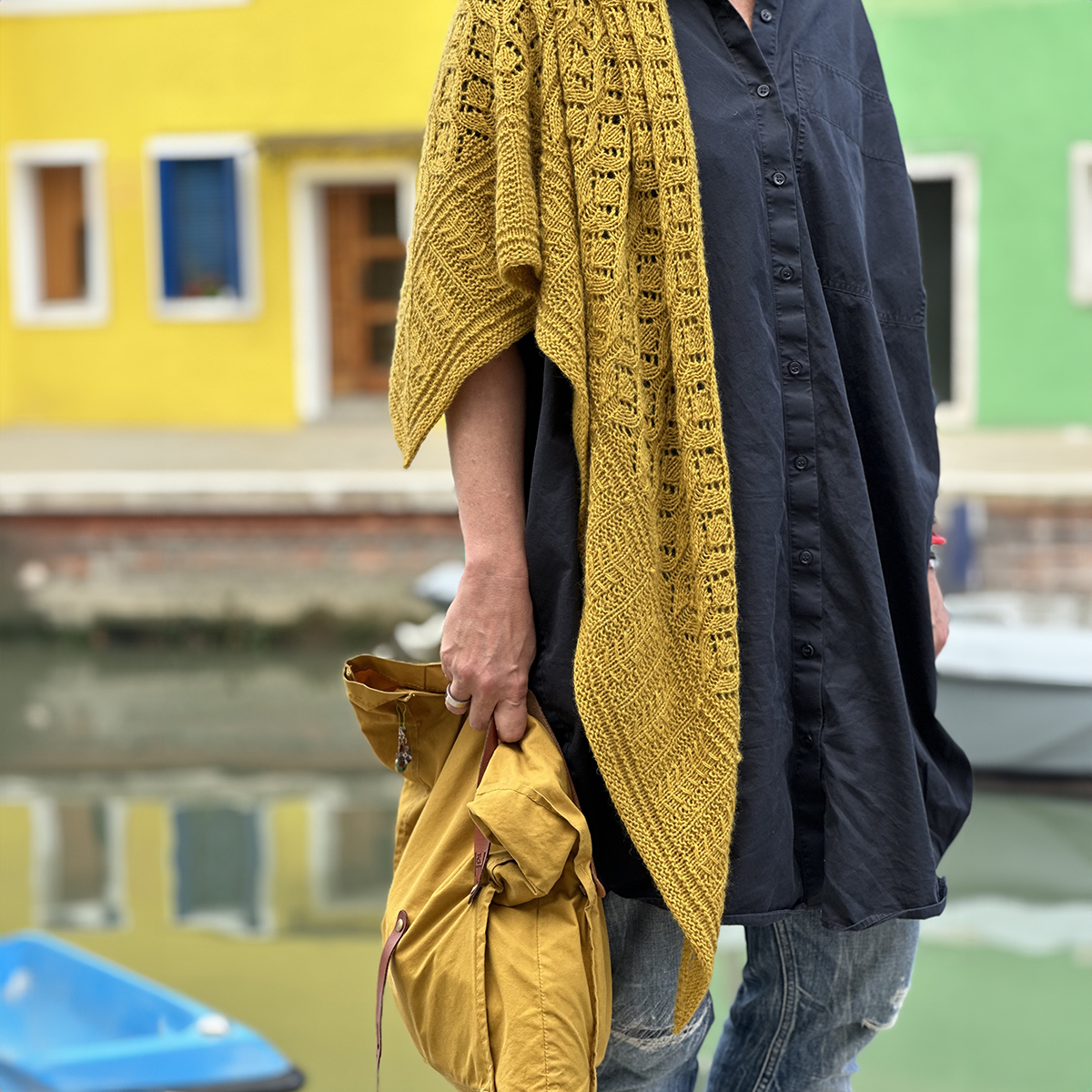 Via con me is a symmetrical triangular shawl, worked back and forth from the top down with the yarn held double throughout. Starting with a garter tab cast on, stitches are increased every RS row at both edges and at the center of the shawl. Instructions for the lace pattern are written out (line by line) and charted. The combination of the cute and easy lace pattern and the wide textured border give this shawl a sophisticated yet casual look.