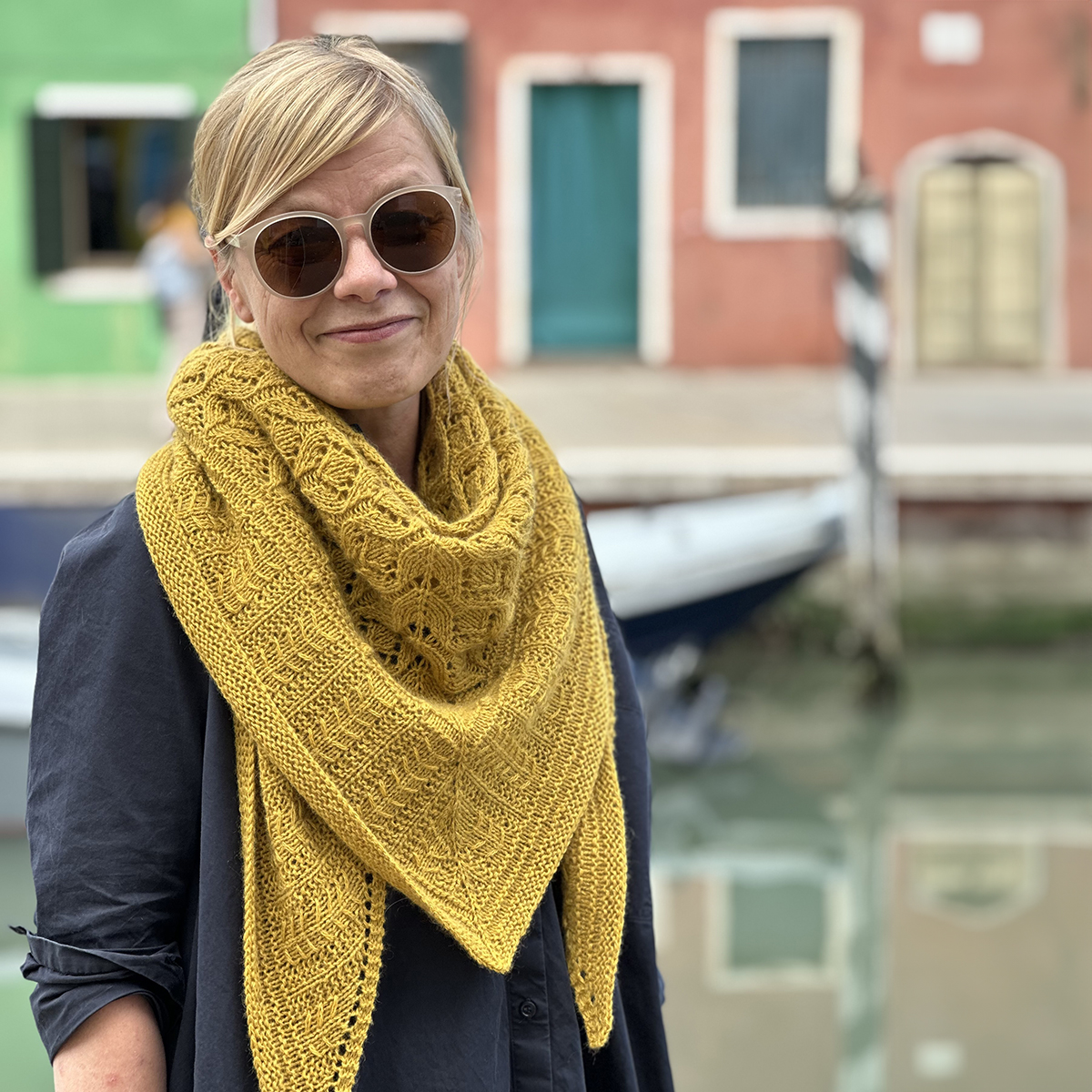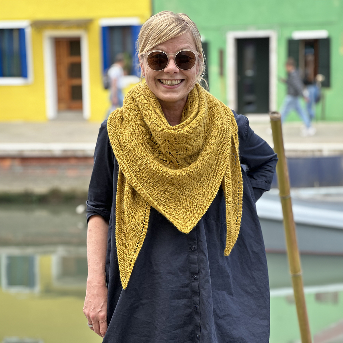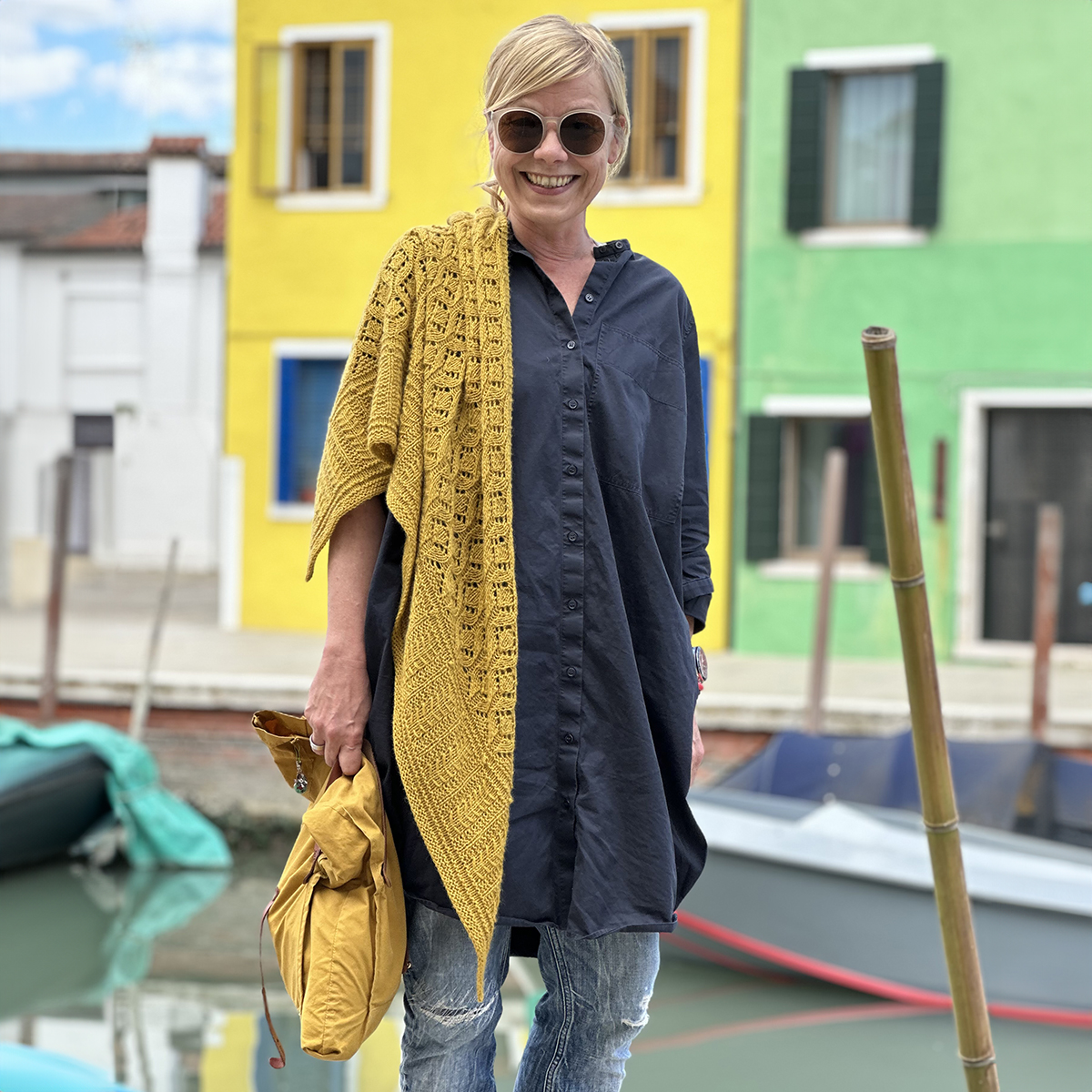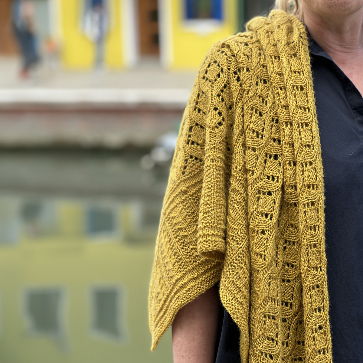 Via con me is a symmetrical triangular shawl, worked back and forth from the top down with the yarn held double throughout. Starting with a garter tab cast on, stitches are increased every RS row at both edges and at the center of the shawl. Instructions for the lace pattern are written out (line by line) and charted. The combination of the cute and easy lace pattern and the wide textured border give this shawl a sophisticated yet casual look.