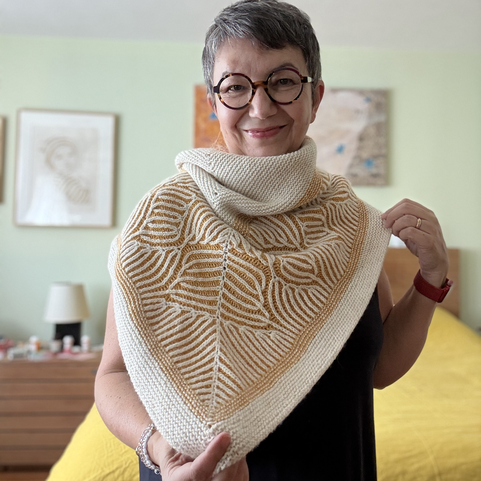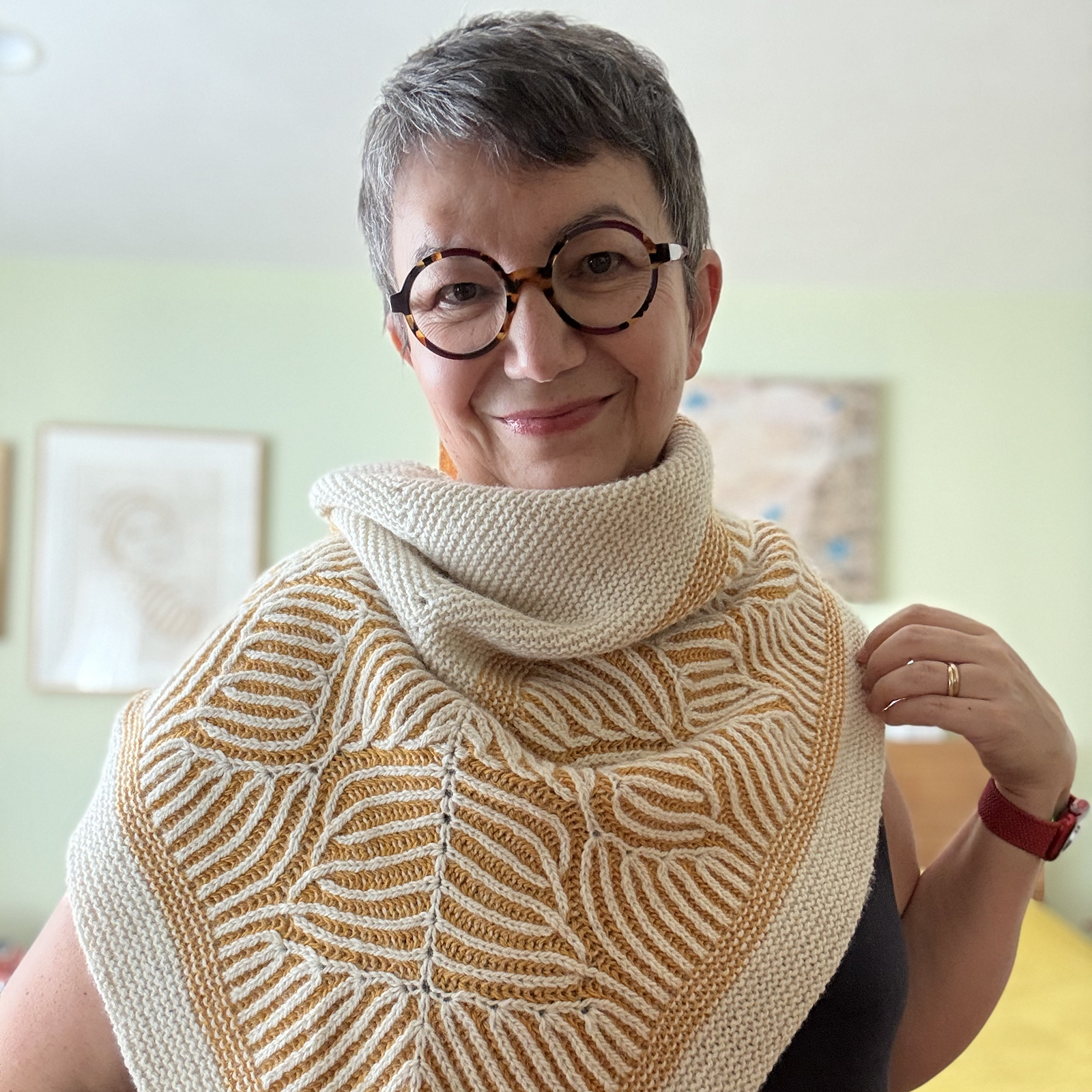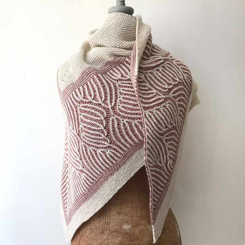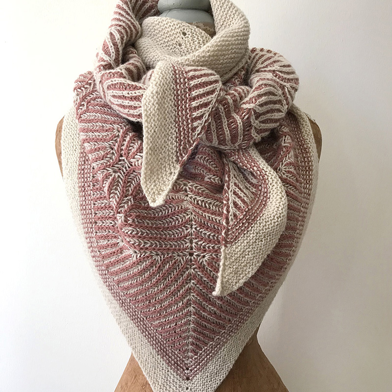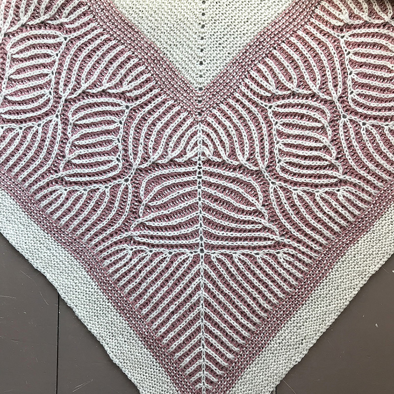 This is a trianglar shaped shawl that begins with a 1-color garter stitch tab, at the top neck, and increases on the sides and at the middle to its full width. A second color is added for a 2-color garter stitch stripe which turns into 2-color brioche.