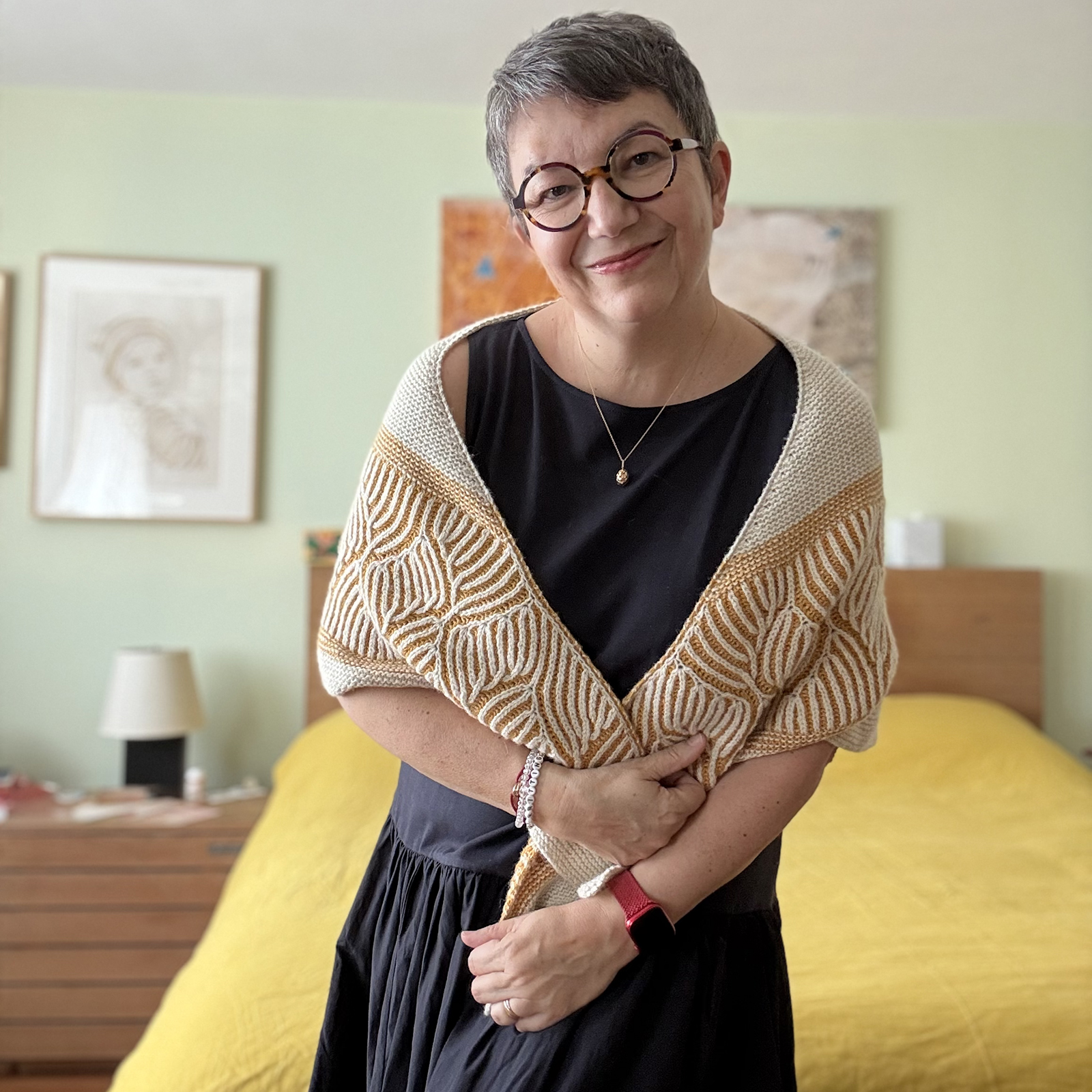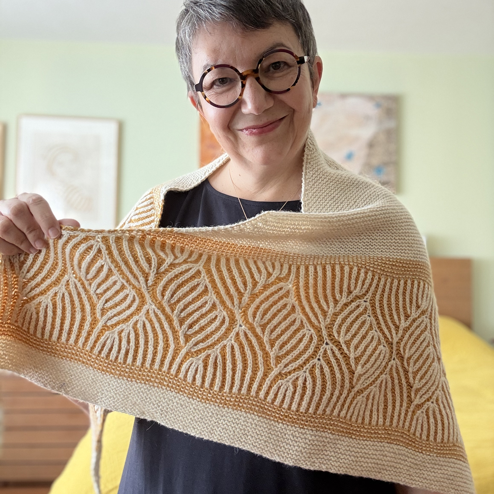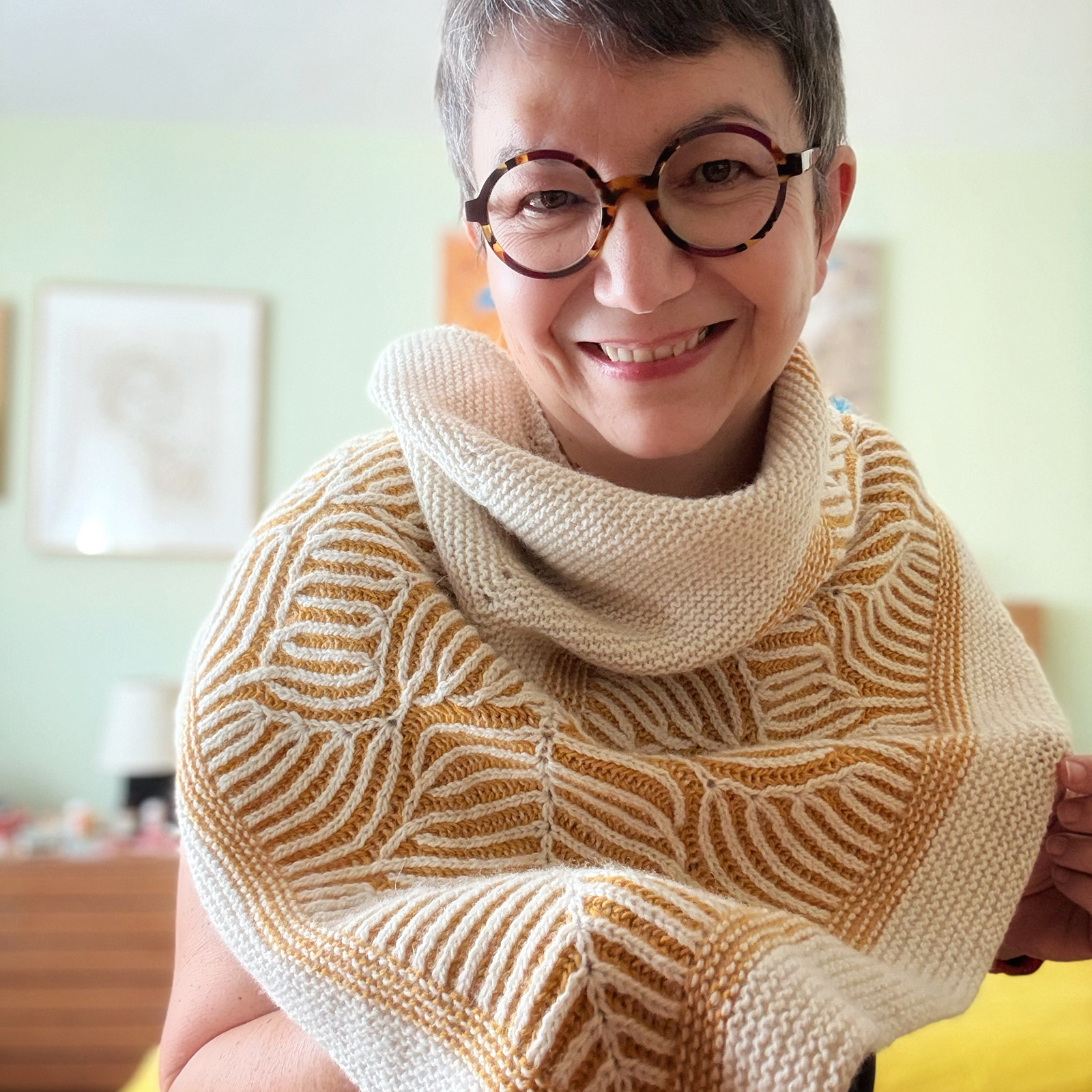 This is a trianglar shaped shawl that begins with a 1-color garter stitch tab, at the top neck, and increases on the sides and at the middle to its full width. A second color is added for a 2-color garter stitch stripe which turns into 2-color brioche.