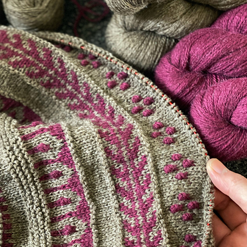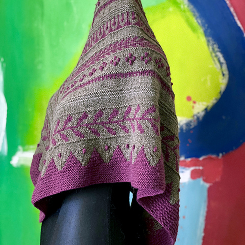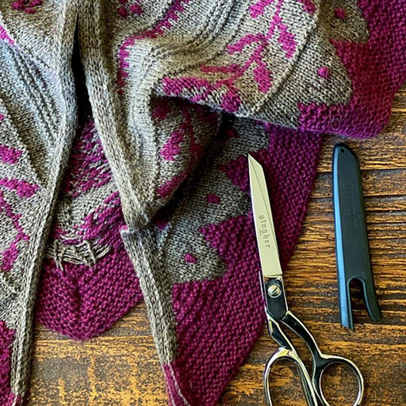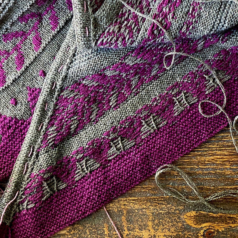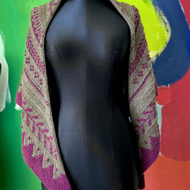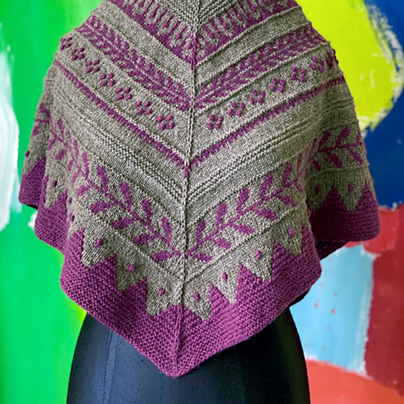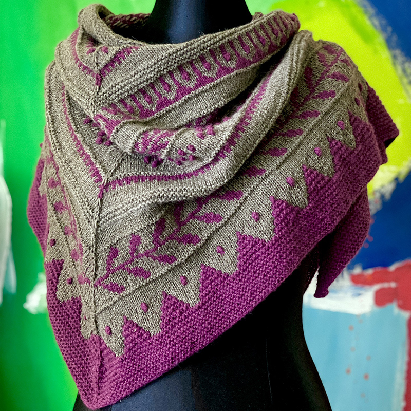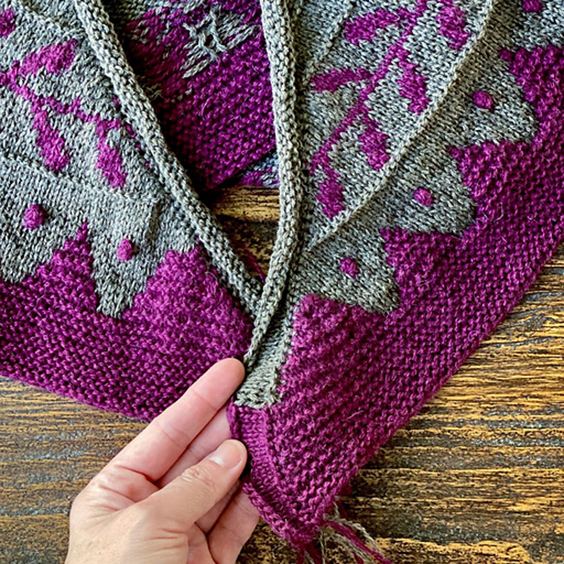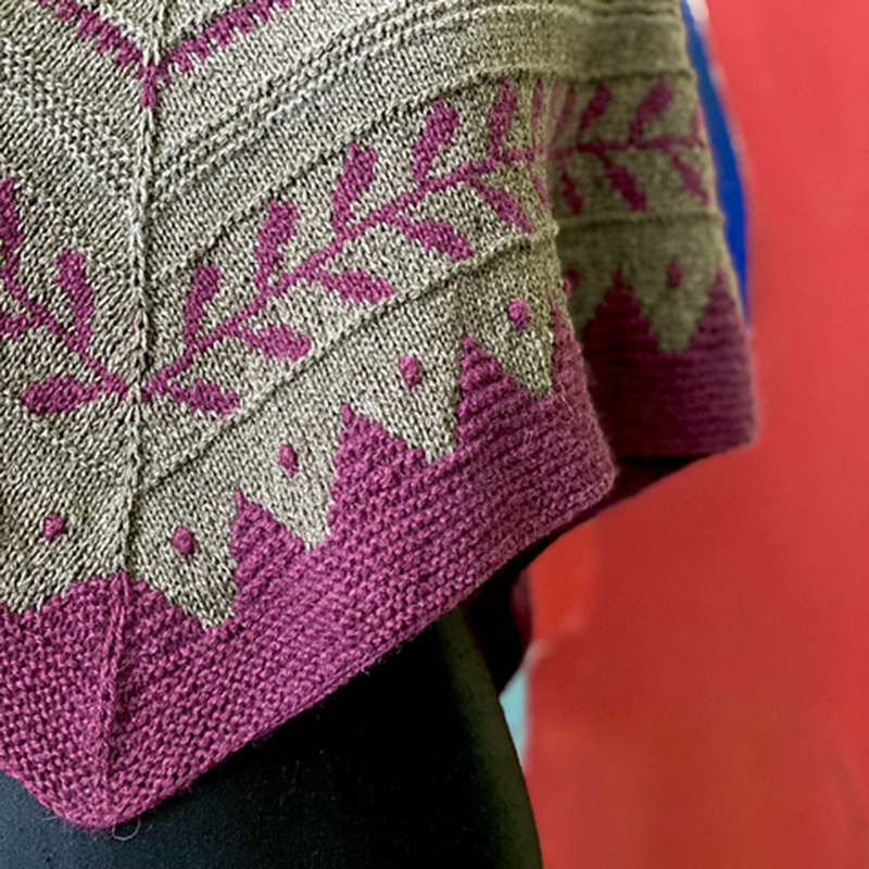 The Woodlark Shawl is knit in the round using 2 colors but shaped like a triangular shaped shawl with increases at the top and the center. After binding off the shawl is steeked along the top edge and stitches are picked up to hide the steek.