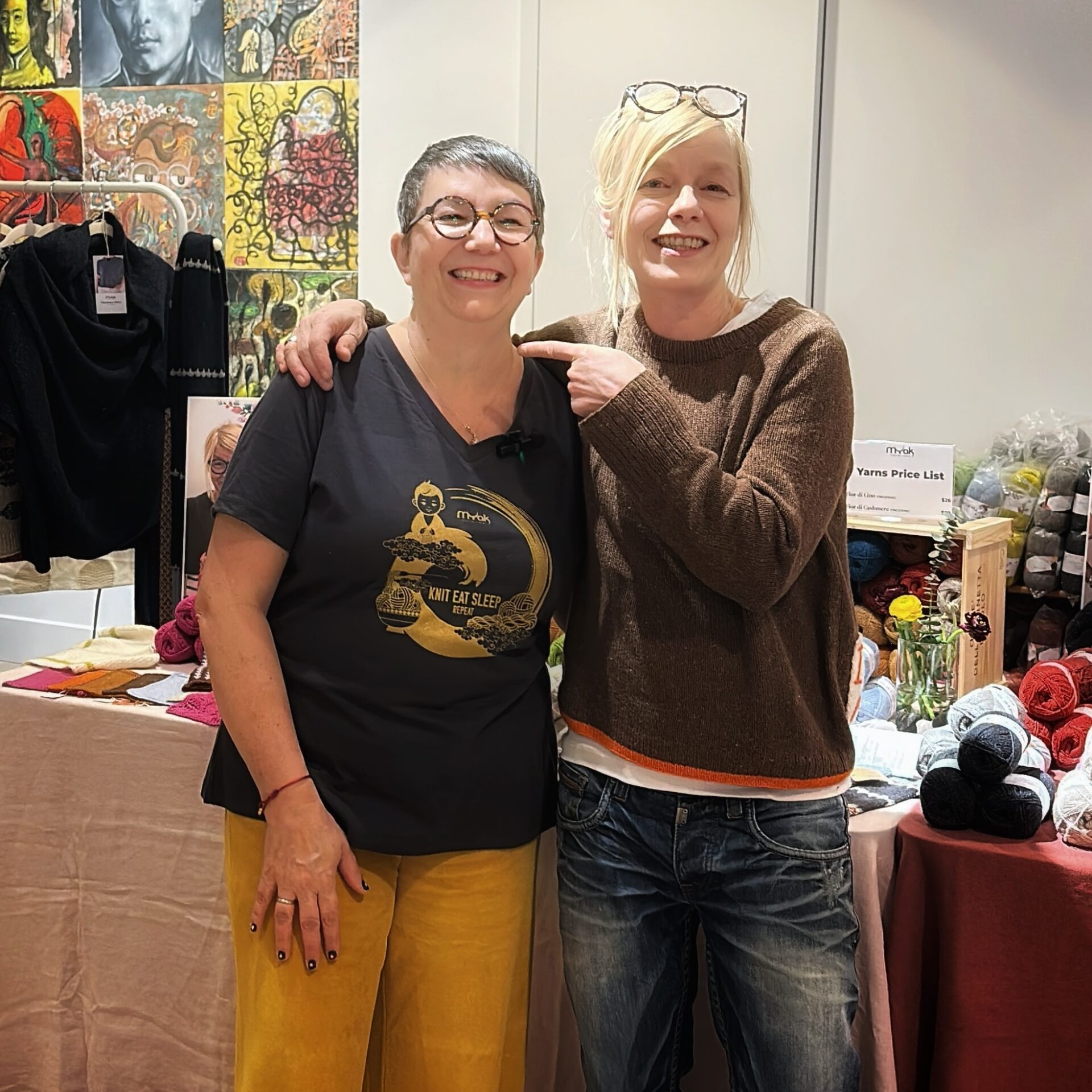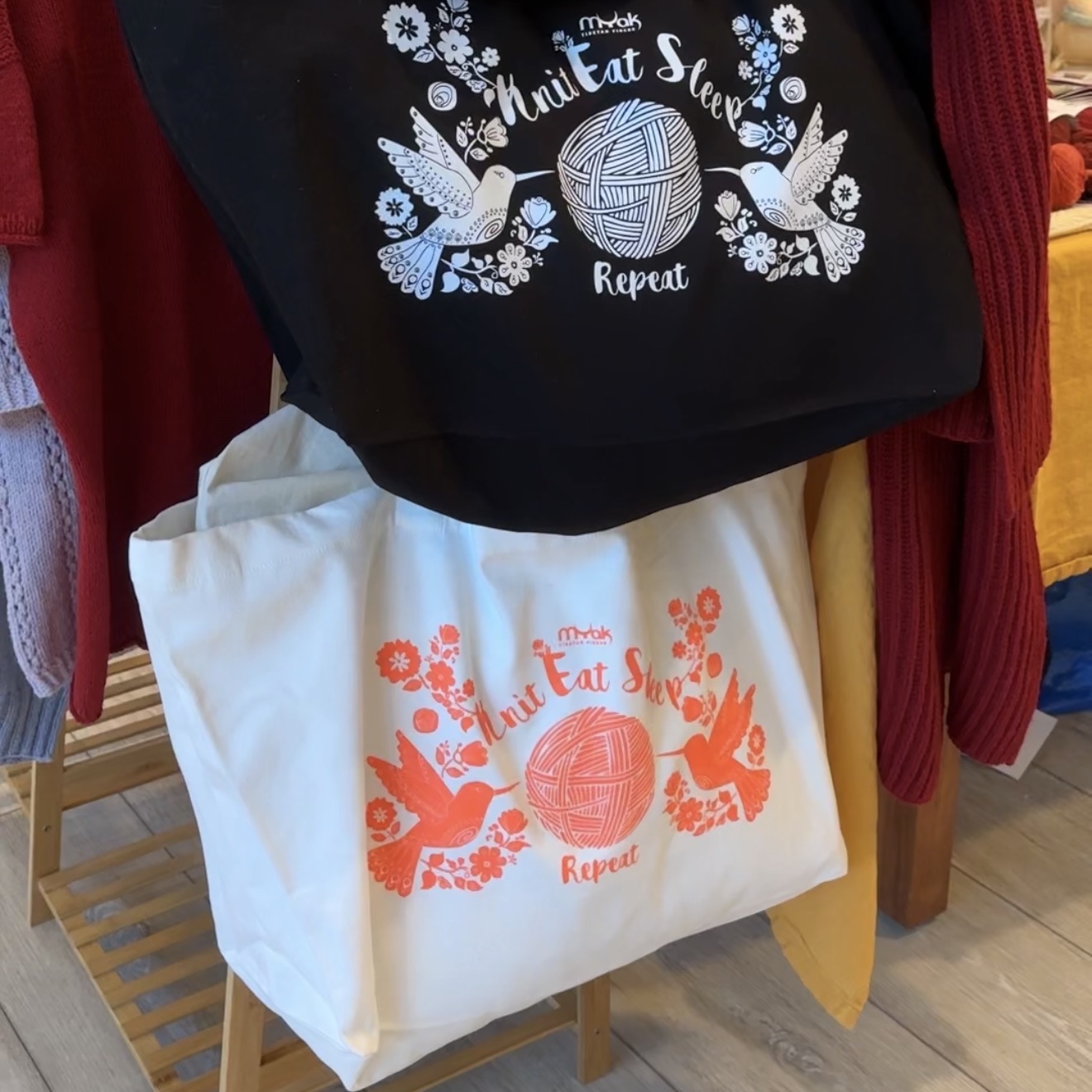The design features two whimsical birds surrounded by delicate flowers, framing a central ball of yarn and our signature motto: Knit. Eat. Sleep. Repeat. A symbol of creativity, rhythm, and gentle devotion to the craft, the illustration evokes the quiet joy of making — wherever you are.